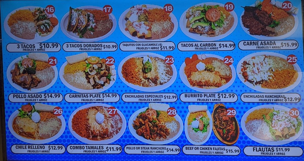 Includes rice, beans and salad with your choice of flour or corn tortillas.
